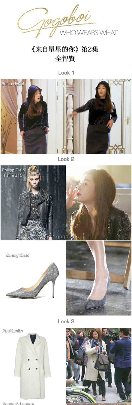 第二集里千頌伊為了親民,上學(xué)時(shí)打扮得客氣些了。不過(guò)看行頭就知道,女神的親民是裝的,因?yàn)椤爸挥猩鐓^(qū)班長(zhǎng)才要親民”。美容室那套撕B裝最氣派,Lanvin大衣配印花裙,袖子瀟灑地挽起來(lái),走路帶風(fēng),氣勢(shì)上就贏了。另外,那雙相當(dāng)于灰姑娘水晶鞋的Jimmy Choo也登場(chǎng)了。